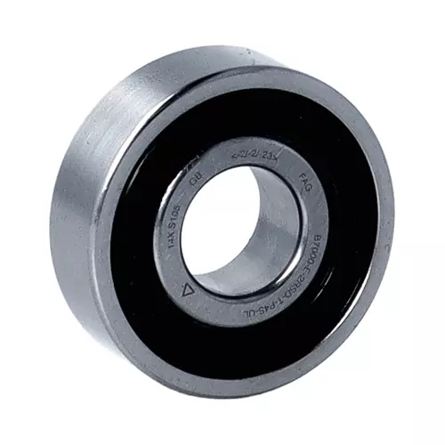 前缀列表:【B:标准钢球轴承】。后缀列表:【-E:接触角 25°】【-2RSD:两侧带非接触式橡胶密封件,且已填充润滑脂】【-T:外圈引导,酚醛增强纤维层压尼龙窗式保持架】【-P4S:AG标准,P4S级精度,高过 DIN620 标准 P4级】【-U:单个轴承,万能配对】【L:轻预紧】。