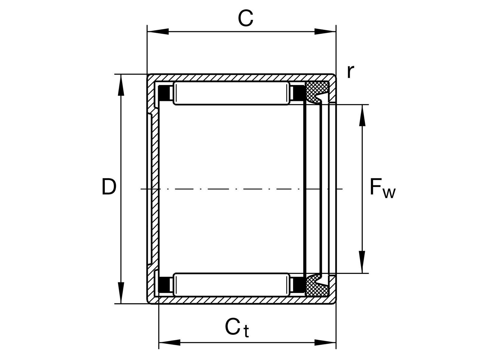 | Ct min | 15.3 mm | 带封闭端的冲压外圈滚针轴承的最小宽度 |
