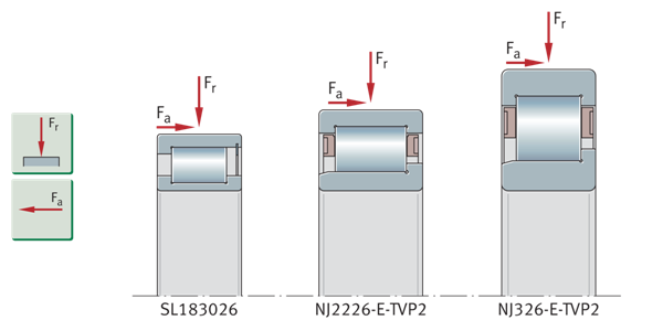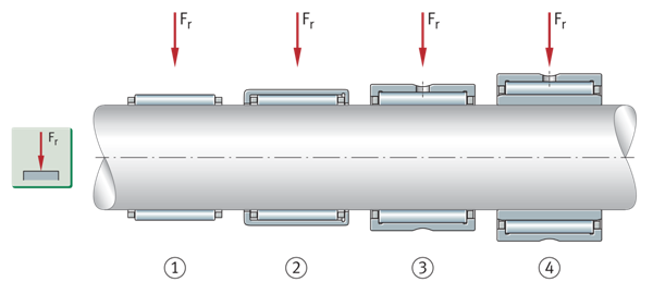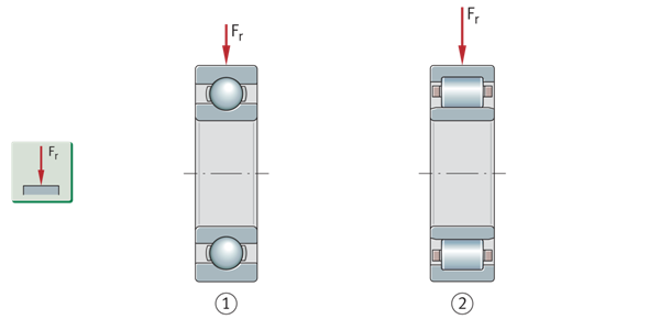 径向承载能力——深沟球轴承/圆柱滚子轴承的比较 ①深沟球轴承–径向承载能力较低 ②圆柱滚子轴承NU系列–径向承载能力更高 | ![]() |