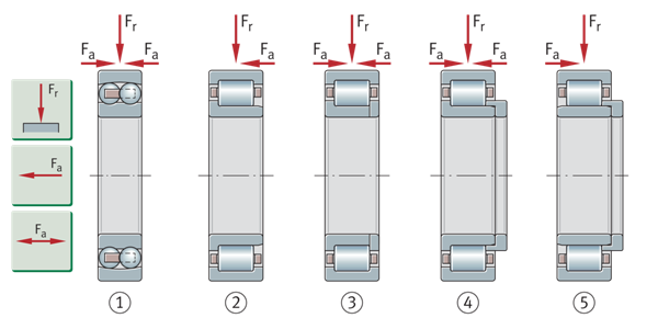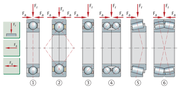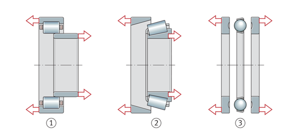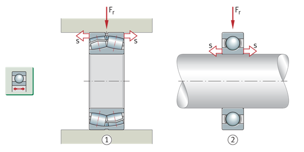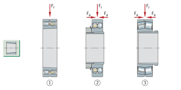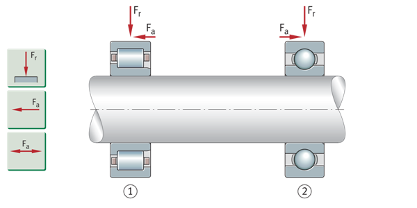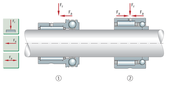 一个方向上存在的轴向载荷只能由单列角接触球轴承和圆锥滚子轴承、圆柱滚子轴承NJ以及NU+HJ和轴向调心滚子轴承支撑。对于交替的负载方向,这些轴承必须始终与第二个轴承一起安装(第二个轴承必须在相反的方向上提供支撑)。对于成组安装,可使用配对的单列角接触球轴承或由两个单个轴承组成的匹配圆锥滚子轴承组。