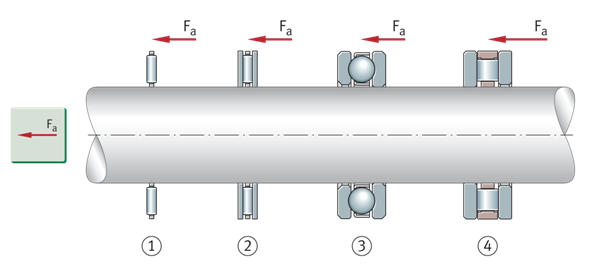 如果轴向载荷分量过高,也可以通过单独的轴承来支撑轴向载荷。除了纯轴向轴承外,使用径向轴承(如深沟球轴承和圆柱滚子轴承或四点接触轴承)可以在两个方向上支撑轴向力。