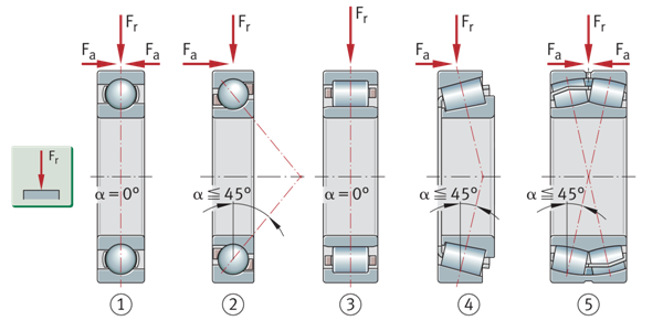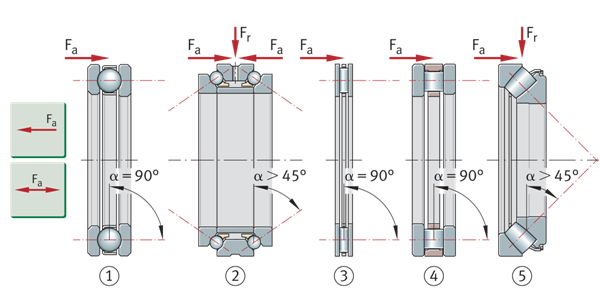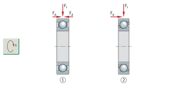 轴承的轴向承载能力由标称接触角α决定。该角度越大,轴承的轴向承载能力就越高。其轴向承载能力也由产品表中的轴承特定轴向载荷系数Y标识,该系数越小,轴向承载能力就越高。