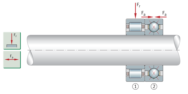 用于支撑组合载荷的圆柱滚子轴承和四点接触球轴承 ①圆柱滚子轴承NU,径向轴承 ②四点接触球轴承,轴向轴承(如果轴承承受纯轴向载荷,则径向不得保留外圈) | ![]() |