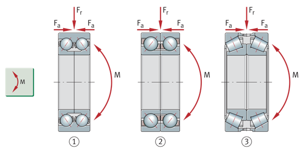 用于支撑倾斜力矩的轴承 M=倾斜力矩 ①双列角接触球轴承 ②角接触滚珠轴承组,包括两个匹配的单列角接触滚珠,O型配对 ③圆锥滚子轴承组,包括两个匹配的单列圆锥滚子轴承,X型排列 | ![]() |