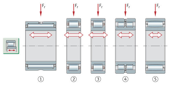 用于轴承内补偿的非定位轴承 ①滚针轴承 ②圆柱滚子轴承NU ③圆柱滚子轴承N ④圆柱滚子轴承SL0248 ⑤环形滚子轴承 | ![]() |