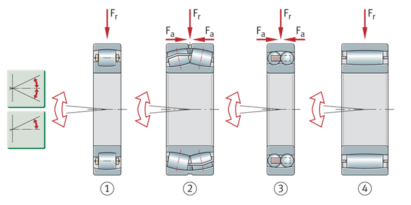 用于静态和动态错位补偿的轴承 ①滚子轴承(非定位轴承) ②调心滚子轴承(定位轴承) ③调心球轴承(定位轴承) ④环形滚子轴承(非定位轴承) | ![]() |