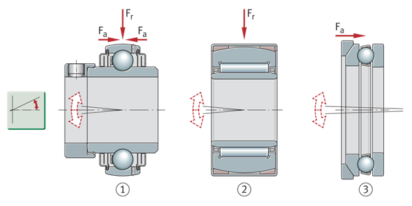 如果轴和壳体之间发生偏斜,例如,如果轴承座未对齐,轴在负载下变形,或者轴承位置相距相当大的距离,则必须通过适当的轴承(自对准轴承)进行补偿。如果使用了单独的外壳,如轴承座或法兰外壳,也应预计会出现错位。类似的影响(轴承位置的对准不准确性)是由滚动轴承环的径向座表面和横向接触表面之间的角度缺陷引起的。