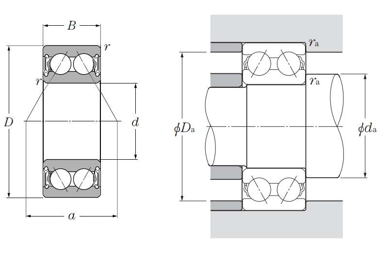 | 双列角接触球轴承 - 双面密封(非接触式橡胶密封) - 尺寸 | |