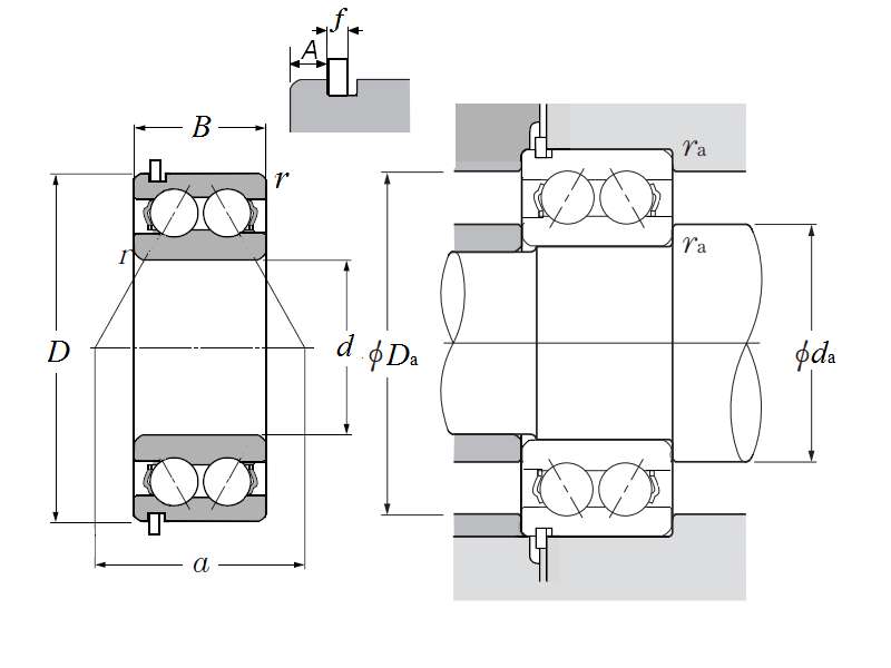 | 双列角接触球轴承 - 开式带止动环 - 尺寸 | |
