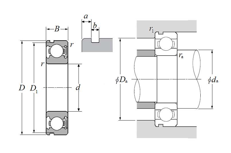 | 单列深沟球轴承 - 单面密封(接触式橡胶密封)带止动环槽 - 尺寸 | |