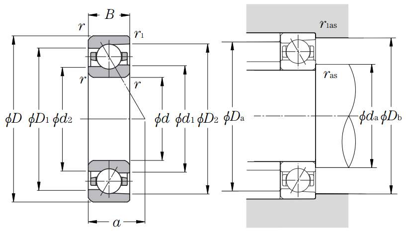 | 单列角接触球轴承 - Ultage系列 - 尺寸 | |