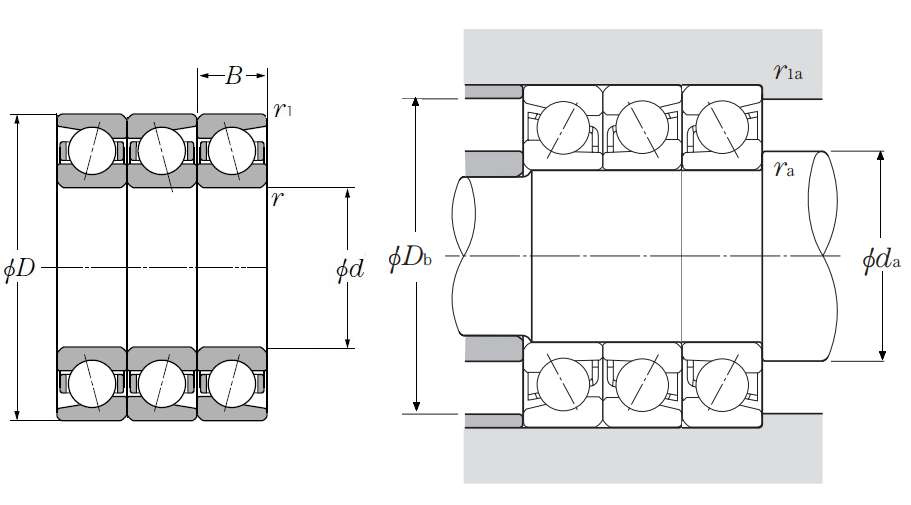 | 多列角接触球轴承 - 背对背配对 - 尺寸 | |