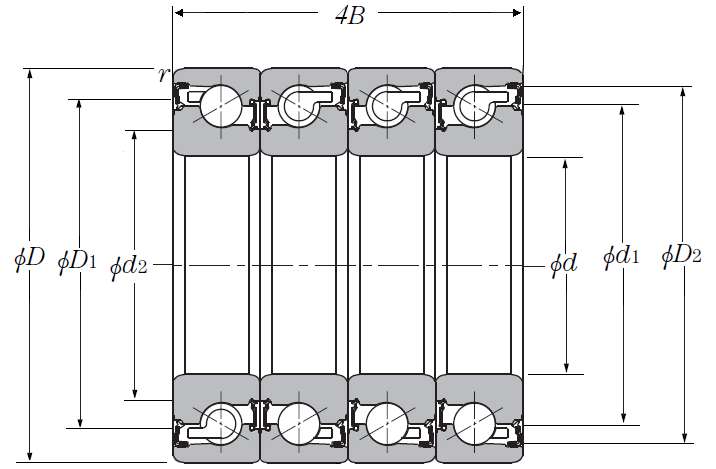 | 滚珠丝杠用四列角接触推力球轴承 - DBTT配对,双面密封,三排承受轴向载荷 - 尺寸 | |