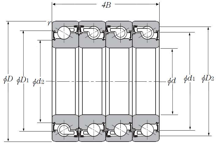 | 滚珠丝杠用四列角接触推力球轴承 - DFTT配对,双面密封,三排承受轴向载荷 - 尺寸 | |
