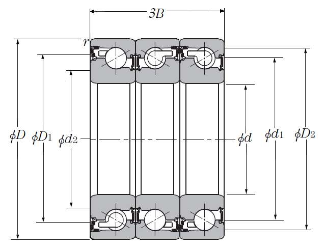 | 滚珠丝杠用三列推力角接触球轴承 - DBT配对,双面密封,两排承受轴向载荷 - 尺寸 | |