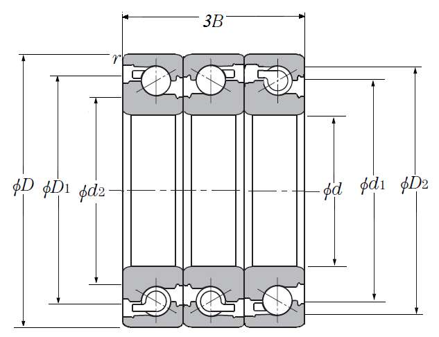 | 滚珠丝杠用三列推力角接触球轴承 - DBT配对,开式,两排承受轴向载荷 - 尺寸 | |