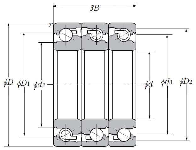 | 滚珠丝杠用三列推力角接触球轴承 - DFT配对,开式,两排承受轴向载荷 - 尺寸 | |