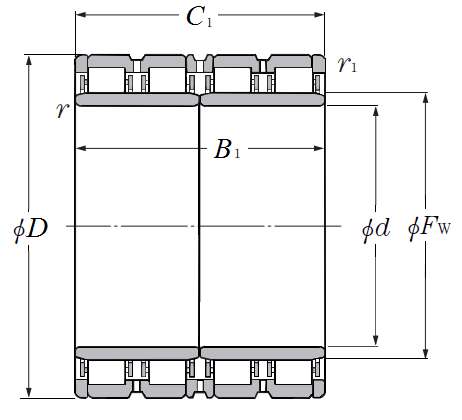 | 四列圆柱滚子轴承带空心滚柱&销式保持架 - 尺寸 | |