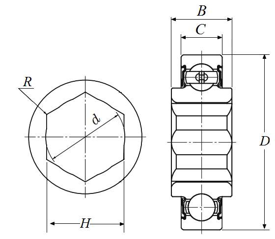 | 带紧定衬套的轴承 - HP型,六角孔,圆柱内径 - 尺寸 | |