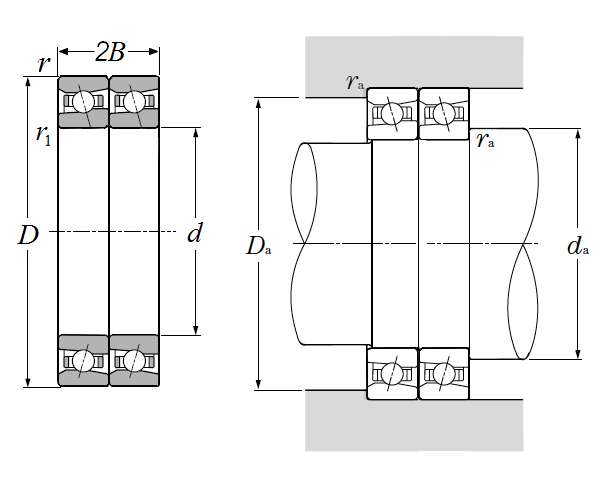 | 超高速双联角接触球轴承,串联配对 - 尺寸 | |