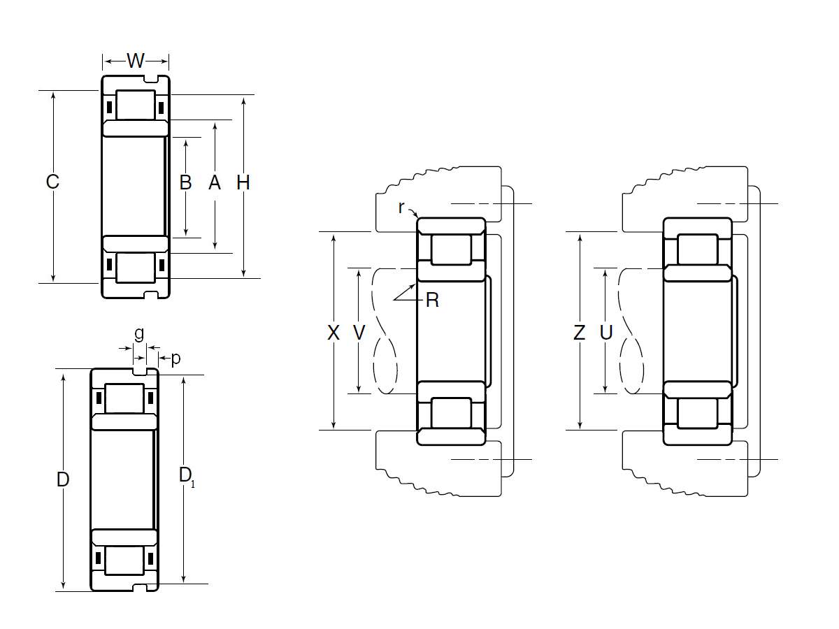 | 圆柱滚子轴承 -可分离型,普通内圈,外圈带两个加强筋,带止动环槽 - 尺寸 | |