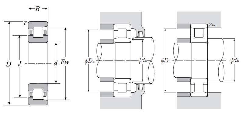 | 圆柱滚子轴承 -可分离型内圈带两个加强筋,外圈带一个加强筋 - 尺寸 | |