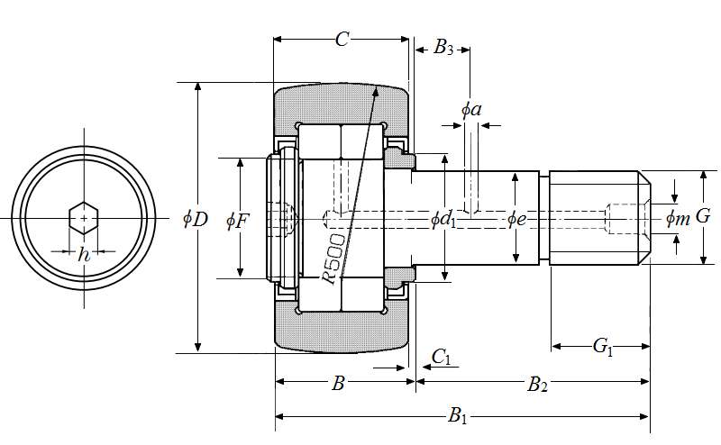 | 凸轮从动螺柱式滚轮轴承 - 球面外圈,NUKR..H型 - 尺寸 | |