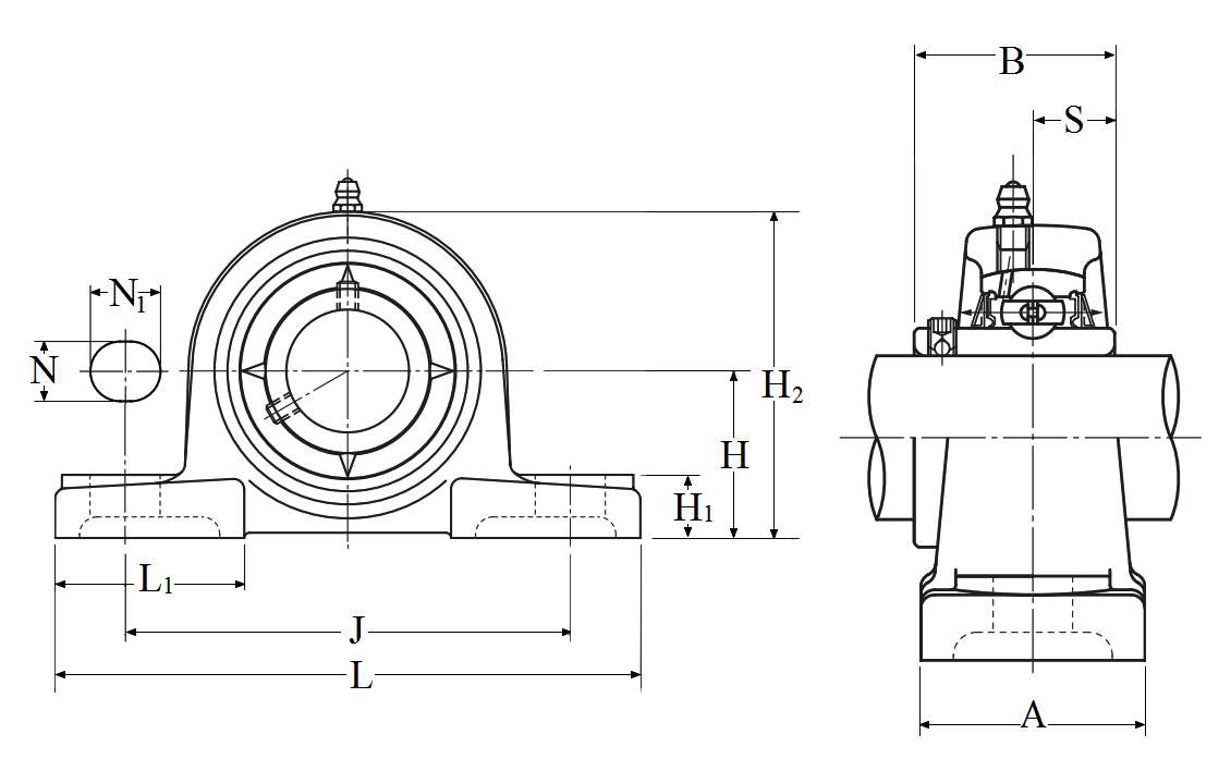 | 轴承座,铸造外壳,中心低,带紧定螺钉,UCPL型 - 尺寸 | |