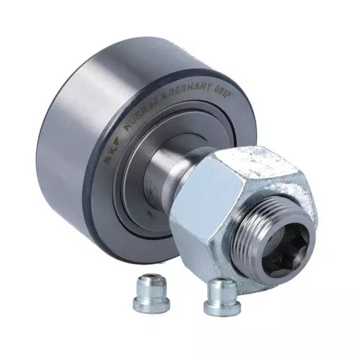 SKF NUKR62A轴承属于凸轮随动件,外径:62 mm,附件直径:24 mm,总长度:80 mm,外圈宽度:28 mm,螺柱上柄的长度:49.5 mm,法兰圈到润滑孔距离:11 mm,端面外圈到端面侧垫圈的距离:1.3 mm,法兰外径:38 mm,螺纹芯柱:M 24x1.5,螺纹长度:25 mm。